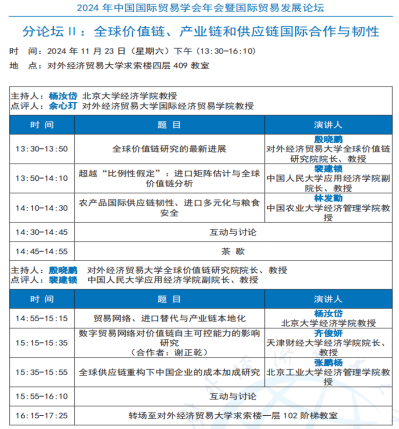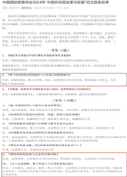 2024年11月22-23日,中国国际贸易学会年会暨国际贸易发展论坛在对外经济贸易大学隆重举行。本届年会以“建设更高水平开放型经济新体制”为主题,并进行了2024年中国国际贸易学会“中国外经贸发展与改革”征文的颁奖仪式。本年度征文活动共收到来自全国各省、自治区、直辖市征文投稿184篇,共评出论文一等奖3篇,二等奖6篇,三等奖19篇。台湾女优