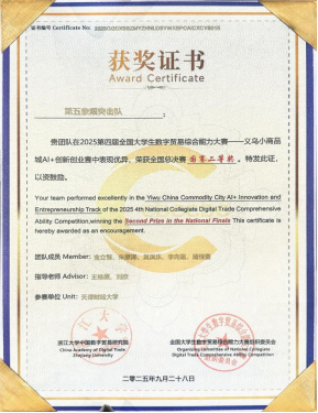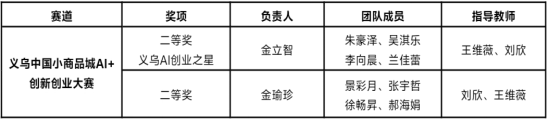 由金立智等五名同学组成的“第五象限突击”队荣获该赛道二等奖及义乌AI创业之星奖;金瑜珍等五名同学组成的“贸e先锋”队同样荣获赛道二等奖。