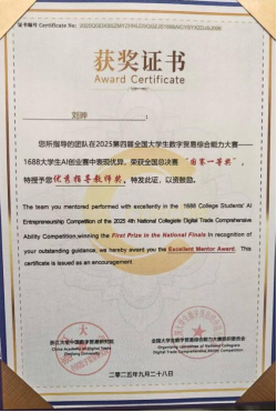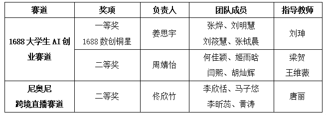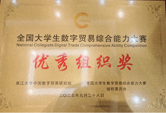 全国大学生数字贸易综合能力大赛由浙江大学中国数字贸易研究院主办,已连续成功举办四届,累计吸引1213所高校、60000余名师生参与。本届大赛中1688大学生AI创业赛道共有240所院校的1198支团队参赛,姜思宇5名同学组成的“呱唧呱唧”队获该赛道一等奖1688数创铜星;由周婧怡5名同学组成的TradeFlux获该赛道等奖。尼奥尼跨境直播赛道共有177所院校的661支团队参赛,佟欣竹5名同学组成的DDL战神获该赛道二等奖。经济学院教师刘珅获优秀指导师奖。