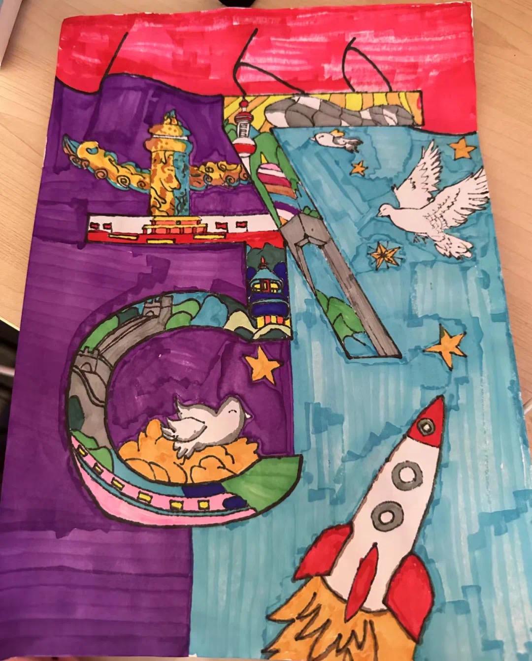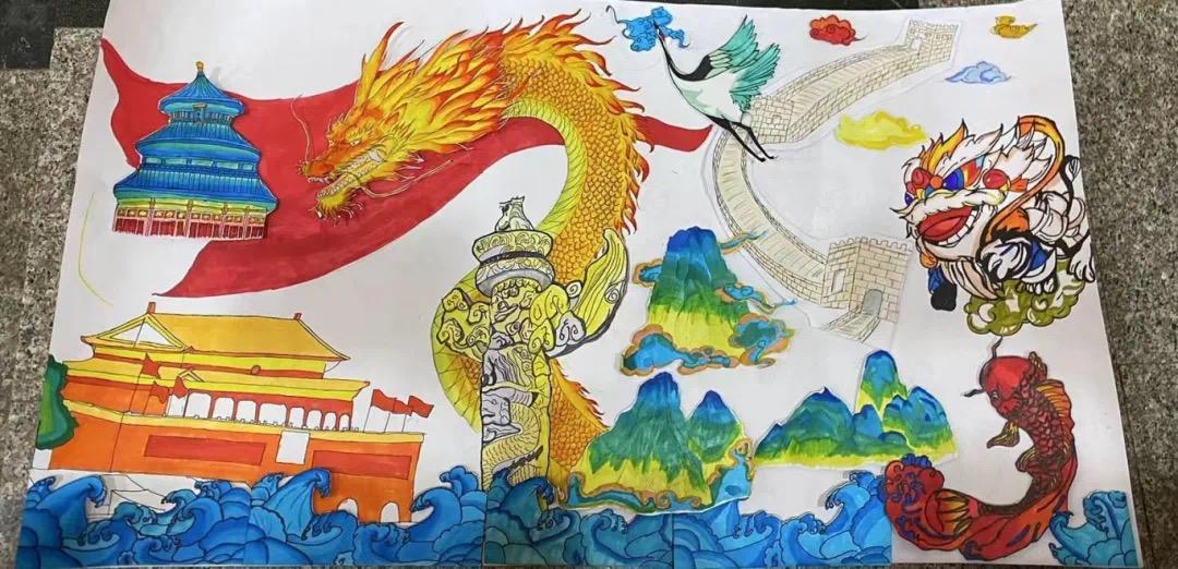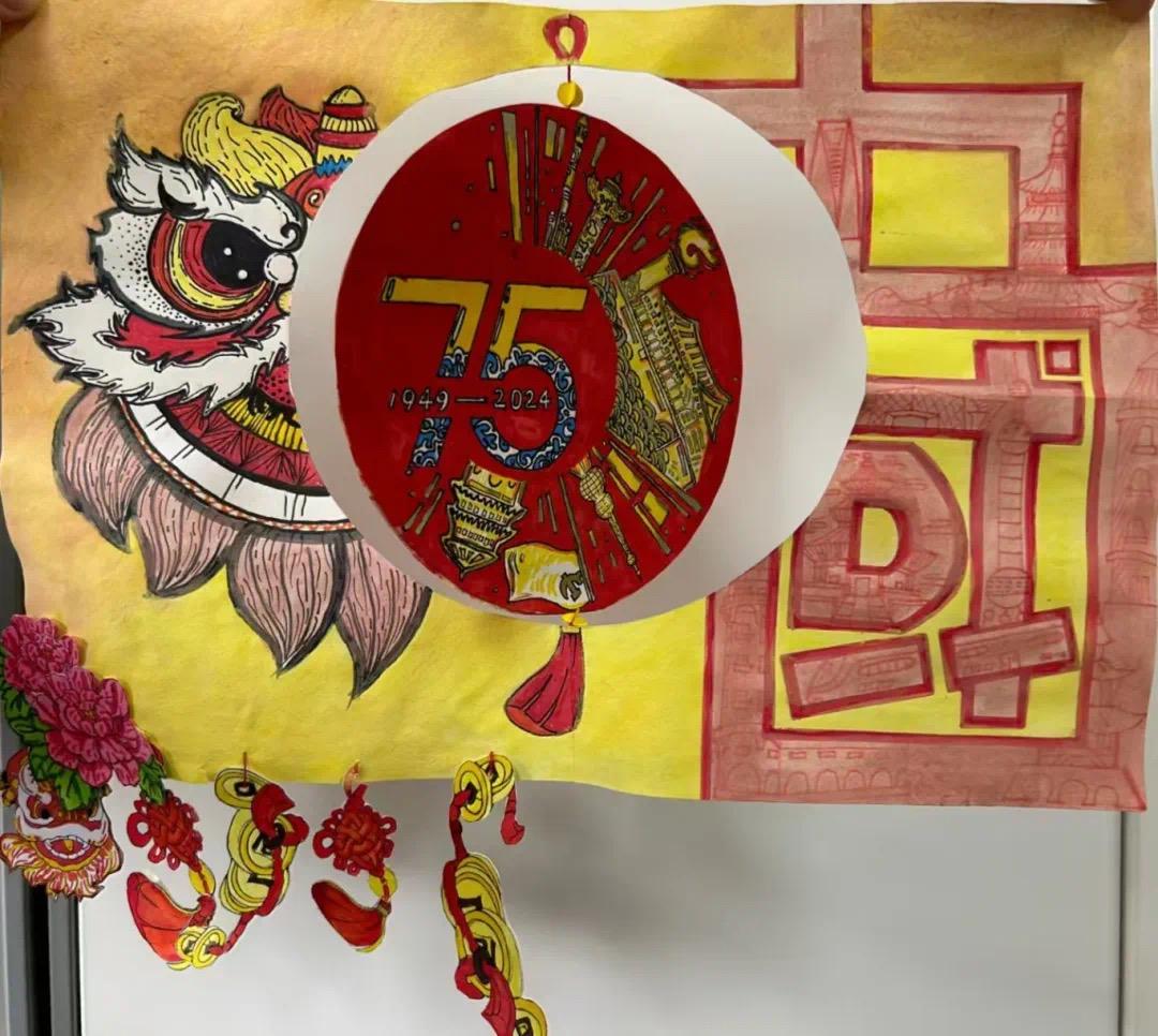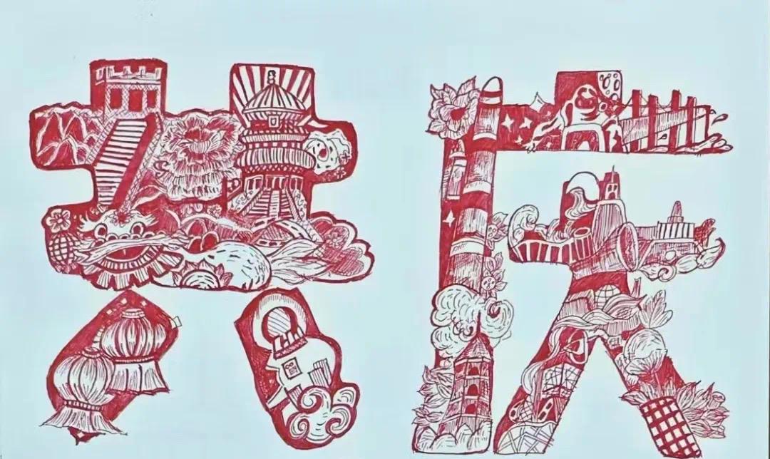 这是一幅精致细腻的画卷,学员们用新颖的笔触勾勒出剪纸的形态,又以许多充满中国意象的图案共同拼凑成共庆二字,给人以深深的震撼。飞扬的巨龙、飘扬的红旗、盛放的牡丹花、发射升空的火箭……小组成员们选取了诸多意象描绘了蓬勃发展的祖国