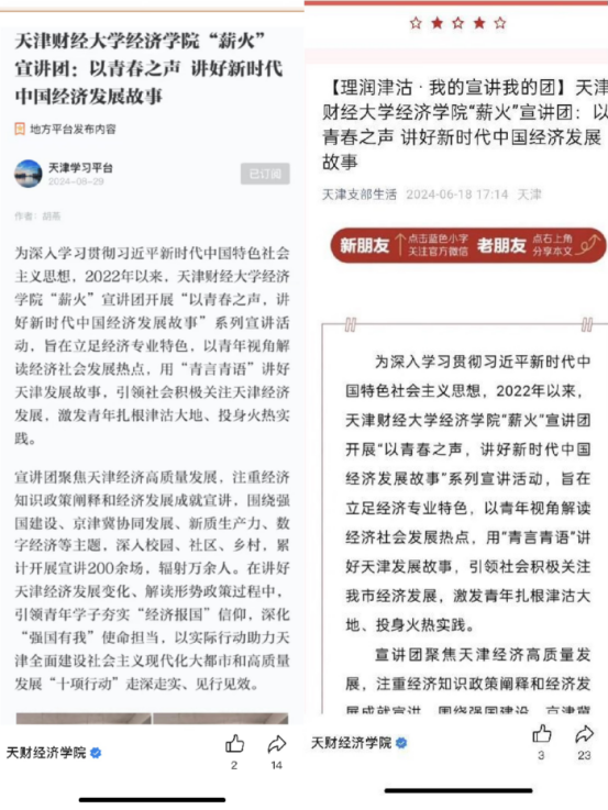 “薪火”宣讲团分别被中共中央宣传部“学习强国”官方账号和中共天津市委党刊《天津支部生活》官方账号报道